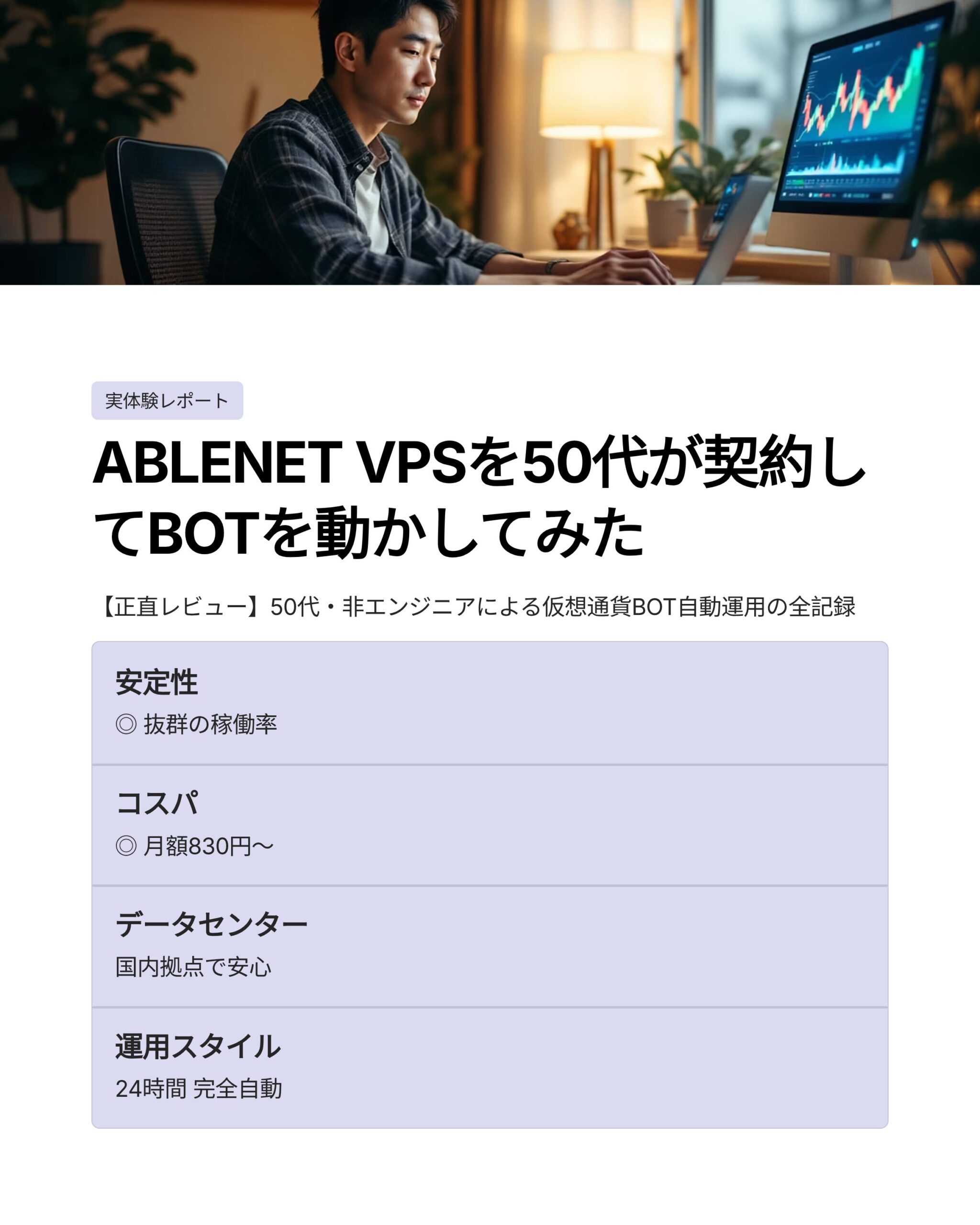 ABLENET VPSは、仮想通貨の自動売買BOTやFX BOTを動かす目的なら、安定性・コスパともに合格点のサービスです。