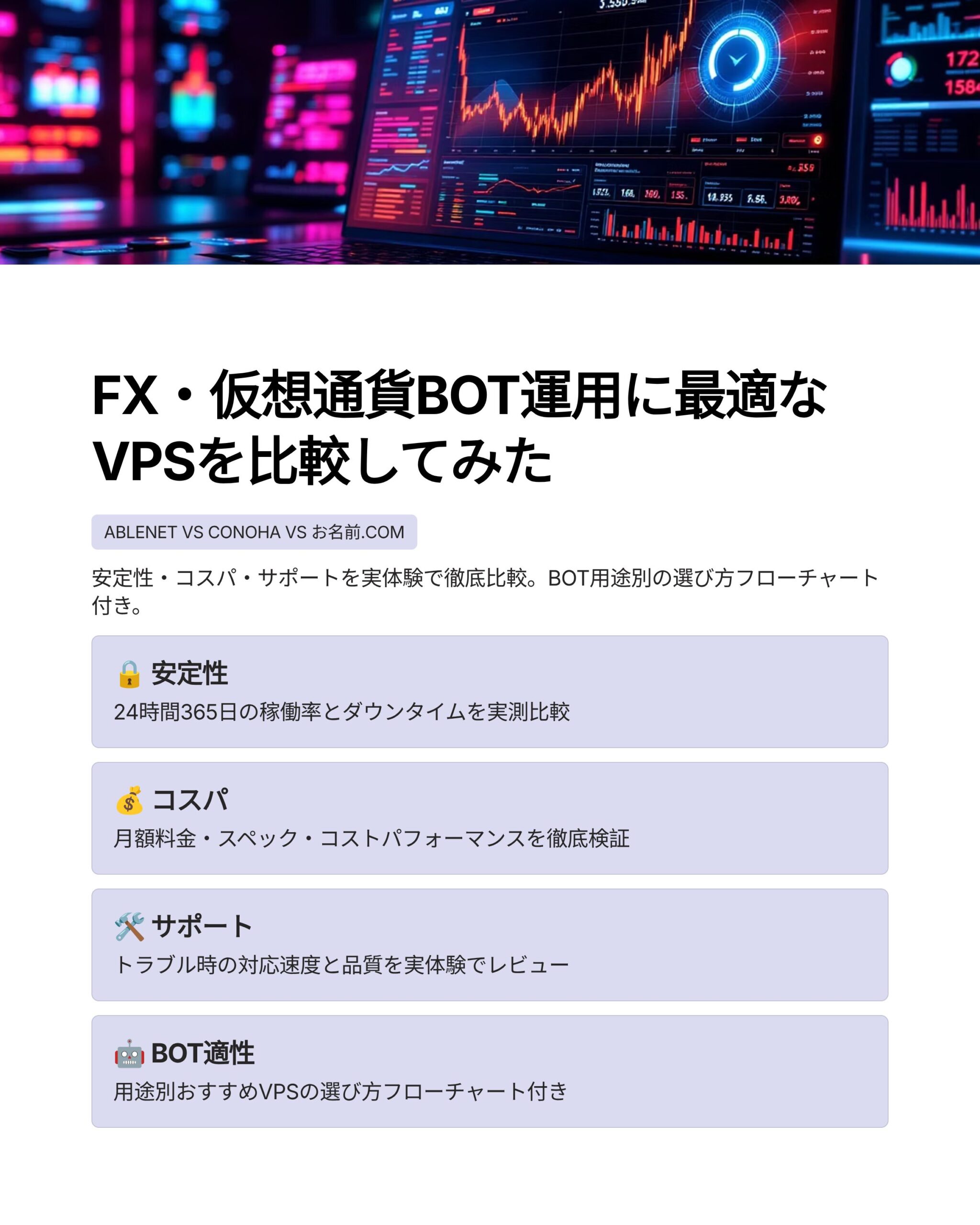 この記事では、VPS選びで実際に迷った経験をもとに、仮想通貨ボット運用に向いているVPS3社を比較します。「結局どれがいいの?」という疑問に、使っている人間の言葉でお答えします。