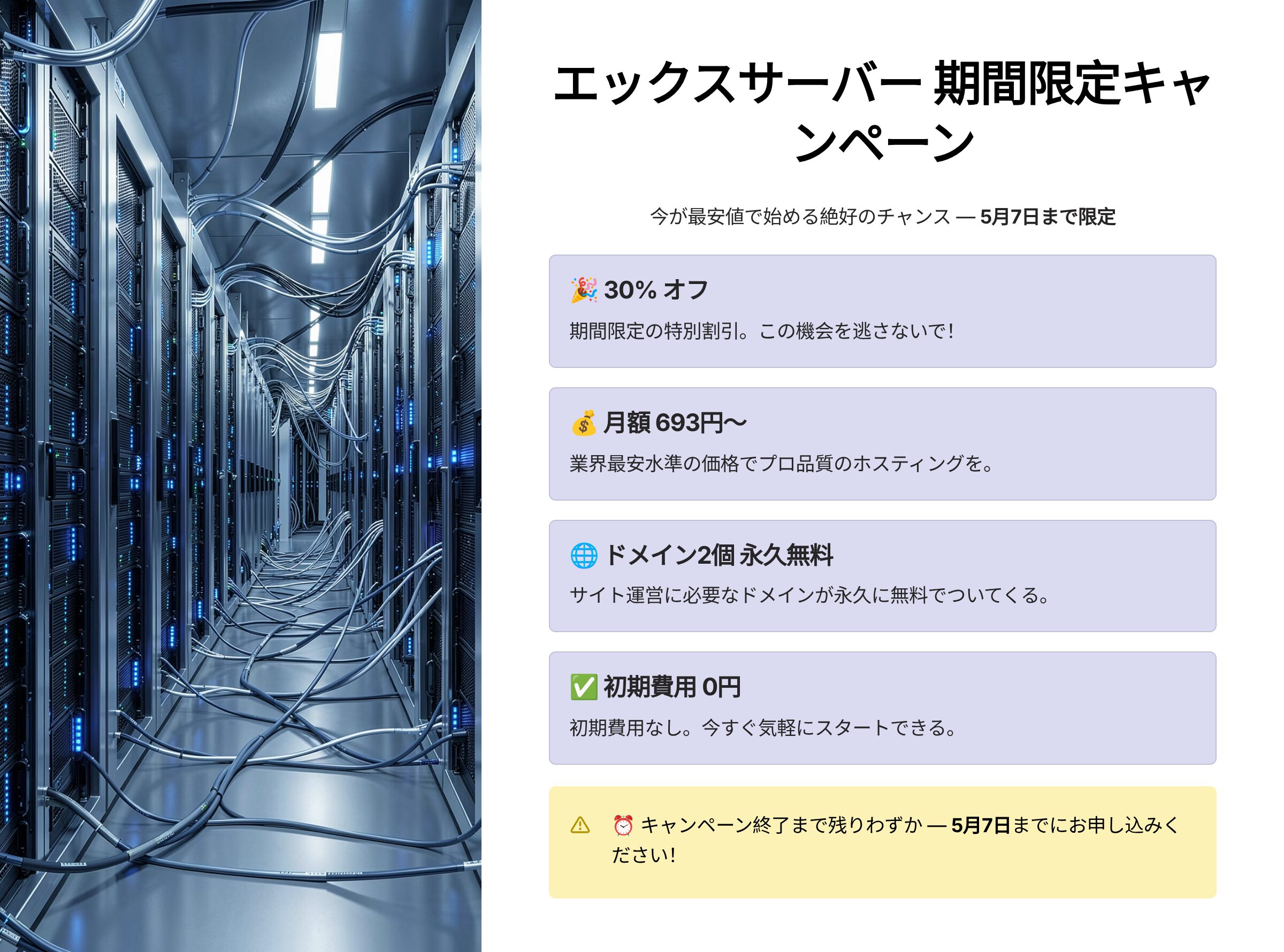 エックスサーバーは常にキャンペーンをやっているわけではありません。30%オフ+ドメイン永久無料+初期費用0円——この3つが揃うタイミングは貴重です。